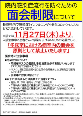 11月27日より「多床室における病室内の面会を原則として禁止」とさせていただきます。やむを得ない事情がある場合などについては、配慮いたしますので、病棟師長にご相談くださいますようお願いいたします。