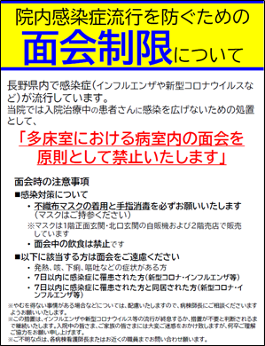 ※この措置は、インフルエンザや新型コロナウイルス等の流行が終息するか、措置が不要と判断されるまで継続いたします。入院中の皆さま、ご家族の皆さまには大変ご迷惑をおかけ致しますが、何卒ご理解ご協力をお願い申し上げます。